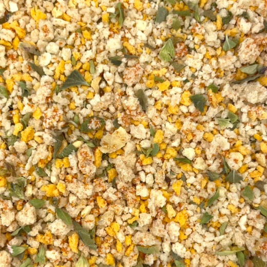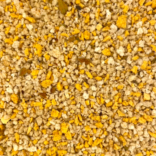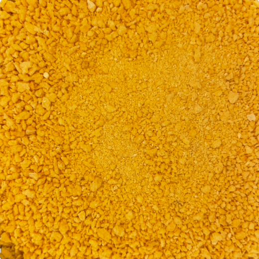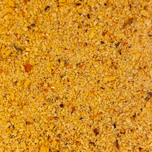 Pan rallado de especias picantes, de granulometría gruesa y color naranja.